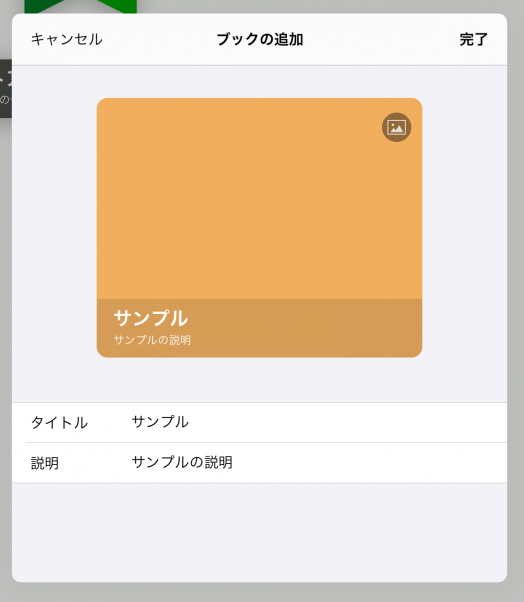 例としてブック名を「サンプル」、説明は「サンプルの説明」として作成します。