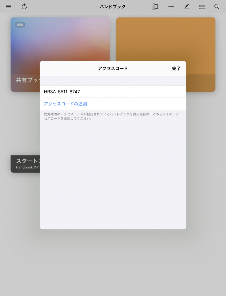 アクセスコード で確認すると追加されたアクセスコードが登録されています。ブックの共有を解除するには、このアクセスコードを削除してください。