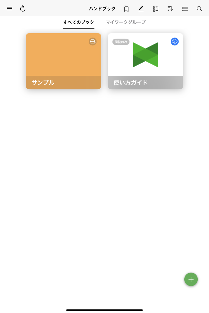 作成するとブックリストに作成したブックが表示されます。ブックは自動的にサーバーに同期されますので、同期を停止する場合には ブックの操作メニューの情報にあるブック情報から サーバーに同期 をオフにします。