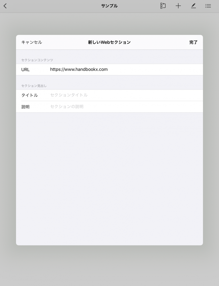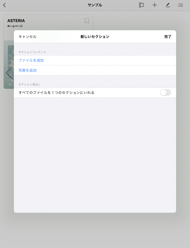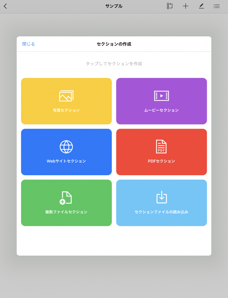 新規作成ボタンをタップすると、セクションを新規作成するメニューが表示されます。