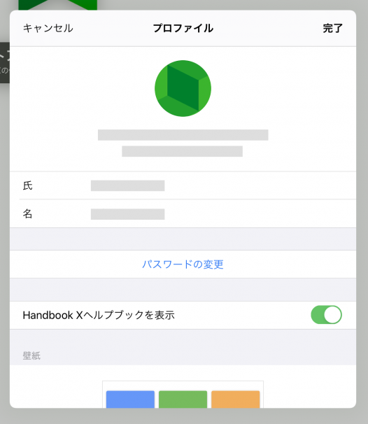 プロファイル画面では、自分のアイコン画像、氏名、パスワード、ヘルプブックと壁紙を管理することが出来ます。
