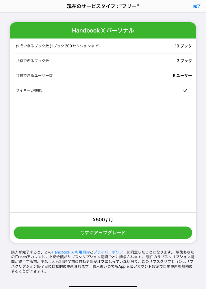 サービスタイプの Handbook X パーソナル を選択してアプリ内決済を使用してください。